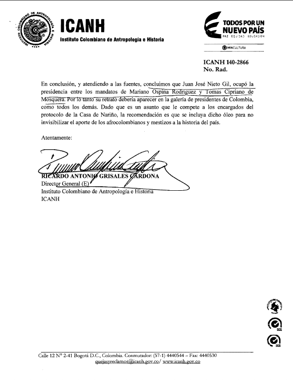 En ningún texto escolar de historia de Colombia ni de ninguna otra naturaleza figura el presidente Juan José Nieto Gil. Tampoco está en la historia ni en la galería de presidentes del partido Liberal, del que fue miembro prominente e histórico. Apenas ahora un retrato suyo recién pintado fue descubierto en la Presidencia de la República como consecuencia de los esfuerzos judiciales y periodísticos desplegados por el director de este documental. Con todo, el cuadro de Nieto Gil no tiene todavía su rostro real ni puesto fijo en la Casa de Nariño y corre el riesgo de ser confinado otra vez en los sótanos del racismo colombiano, si es que ya no está de nuevo allá.
